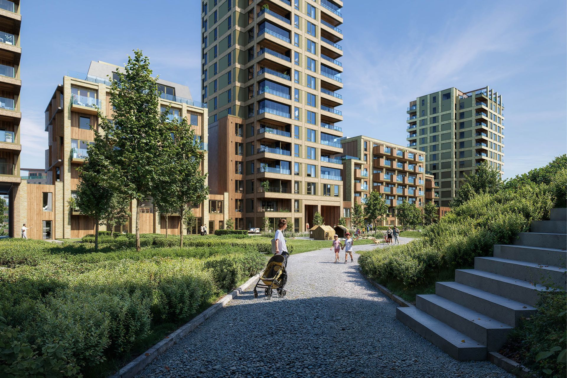 Bygget har fått en lekker fasade i elegant tegl, og er en del av en karrébebyggelse som omslutter en av Stavangers største parker – som en grønn oase midt på tomten. Her kan alle ferdes trygt og du kan nyte en pause i solen, skjermet fra trafikk og støy. Parken blir også et naturlig samlingspunkt for naboene – et sted for småprat, pikniker, grillkvelder og de små, tilfeldige møtene som gjør et nabolag levende.